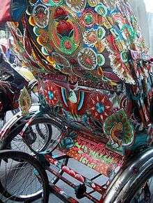 Rickshaw art covers whole rickshaw decoration, from painted backboards and rear side panels to cut-outs appliquéd on to hoods and brass vases replete with plastic or paper flowers. The painted rectangular metal board at the backside, between the two wheels, leaves a trail of passion that the Rickshaw artist puts in his creations.[3]