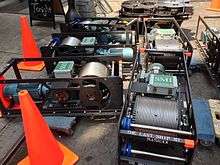 Yo-yo, pile-up, or pilewind, hoists use yo-yo type devices instead of helically grooved drums. The yo-yos lines are coiled into overlapping layers of cable in the narrow slots. The pile-up drum hoists are usually used in low load. As the hoists are narrower than helically grooved drum hoists, these can be used in the places with limited space.[7] Pile-up drum hoists can be mounted in many locations including ceiling, floor or wall mounting. Typical applications are to have a pile-up drum hoist with many pulleys to control a batten.[8] Since the line is piled up on itself, this type of drum hoist provides a zero fleet angle solution.[9]