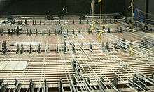 The grid deck, gridiron deck, or grid, is a permeable working surface present at the top of many fly lofts that is used to support and provide access to many of a rigging system's components. Though originally constructed of wood, down-facing three-inch steel channels with three-inch gaps became the prevalent grid decking in the 20th century. Today, large-opening heavy-duty steel bar grating is most common in new theatres. The grid deck surface is usually rated to support live loads as well as all anticipated dead-hung equipment and hemp and motorized (e.g., chain hoist) spot rigging. Its permeability facilitates the mounting of equipment and the passing of lift lines and electrical cables. Spot rigging is not feasible without a grid.