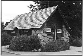 The Plaza Comfort Station (building 68) was built in 1938 to provide public showers, restrooms, and general services to park visitors. It is located on the east side of the Rim Village plaza area. The building is a one-story, wood-frame structure with heavy native stone applied to the exterior.[3][12] The Plaza Comfort Station was listed on the National Register of Historic Places in 1988 as Comfort Station No. 68 (NRHP #88002624).[9]