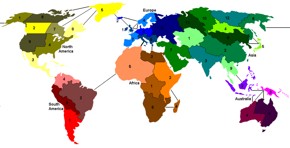 The following is a typical layout of the Risk game board, with a table of the corresponding continent and territory names.[21] Each territory on the typical Risk game board represents a real-life geographical or political region on Earth. As such, the territory borders are drawn to resemble the geography of those regions. This provides an interior space on which to place the army units, adds an element of realism to the game, and also adds complexity. The map is not accurate nor is it drawn to scale; New Zealand, for instance, is missing.