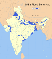 India experiences an average precipitation of 1,170 millimetres (46 in) per year, or about 4,000 cubic kilometres (960 cu mi) of rains annually.[3] Some 80 percent of its area experiences rains of 750 millimetres (30 in) or more a year. However, this rain is not uniform in time or geography. Most of the rains occur during its monsoon seasons (June to September), with the northeast and north receiving far more rains than India's west and south. Other than rains, the melting of snow year round over the Himalayas feeds the northern rivers to varying degrees. The southern rivers, however experience more flow variability over the year. For the Himalayan basin, this leads to flooding in some months and water scarcity in others. Despite extensive river system, safe clean drinking water as well as irrigation water supplies for sustainable agriculture are in shortage across India, in part because it has, as yet, harnessed a small fraction of its available and recoverable surface water resource.[4] India harnessed 761 cubic kilometres (183 cu mi) (20 percent) of its water resources in 2010, part of which came from unsustainable use of groundwater. Of the water it withdrew from its rivers and groundwater wells, India dedicated about 688 cubic kilometres (165 cu mi) to irrigation, 56 cubic kilometres (13 cu mi) to municipal and drinking water applications and 17 cubic kilometres (4.1 cu mi) to industry.[3]