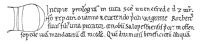 Part of the prologue of a life of St Winifred by Robert of Shrewsbury, Bodleian Mss. Laud c.94. It is addressed by Robert to Domino et patri Guarino reverendo priori Wigornie: Master and father Warin, the reverend prior at Worcester.[3]
