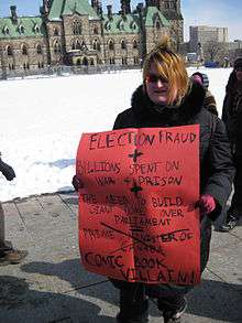 - ↑ The Council of Canadians (March 2012). "Get Fraud Out Of Parliament. Demand Public Inquiry/By-Elections!". Retrieved March 8, 2012.
