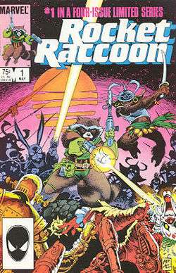 Rocket Raccoon first appeared in Marvel Preview #7 (Summer 1976), in the back-up feature "The Sword in the Star", under the name "Rocky".[4][5] He would next appear in The Incredible Hulk #271 (May 1982), where it is learned that "Rocky" is short for "Rocket". In 1985, he received his own four-issue limited series and in an afterword to the first issue, Mantlo himself asserted that this was the same character seen in Preview, penciled by Mike Mignola and inked by Al Gordon with Al Milgrom. Rocket appeared in Quasar #15 in 1990 and later appeared in three issues of Sensational She-Hulk in 1992 (#44-46).[3] The character only appeared in a total of ten comic books in his first thirty years of existence.[6]