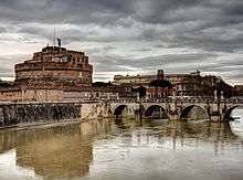 Hadrian had a grand mausoleum, now better known as the Castel Sant'Angelo, for himself and his family in the Pons Aelius in 120 AD. In addition to its fame as the resting spot of the emperor, the construction of the mausoleum is famous in its own right, as it has a particularly complex vertical design. A rectangular base supports the usual cylindrical frame. Atop the frame is a garden roof with a baroque monument bearing the statue of an angel.[17] The original statue, that of a golden quadriga, among other treasures fell victim to various attacks when the mausoleum served as a castle and a papal fortress during the Middle Ages. Over a century would pass before a new mausoleum would house the remains of an emperor. The corruption of the Severans and the Third Century Crisis did not permit very much opportunity for such a glorious memorialization.[18]