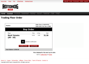 Like most fantasy sports games, the core elements of RotoHog's flagship stock exchange game involve building a team and setting a line-up to earning points. To this traditional core game, RotoHog adds a liquid market for players that all team managers use to trade players. Players can be traded at almost any time and player prices reflect up-to-the minute supply and demand. This trading system removes many of the problems with unfair trades or collusion between managers that can occur in traditional fantasy games.[11]