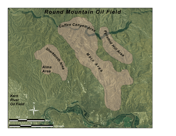 The Round Mountain Oil Field is a large oil and gas field in the foothills of the Sierra Nevada, about 10 miles (16 km) northeast of Bakersfield, California, United States. It is east of the giant Kern River Oil Field, one of the largest in the United States, and also close to the Mount Poso Oil Field and Kern Front Oil Field. With a cumulative total recovery of more than 110 million barrels of oil, it is the 48th largest oil field in California, but remains relatively productive with still about ten percent of its reserves remaining in the ground, according to the California Department of Oil, Gas, and Geothermal Resources (DOGGR).[1]