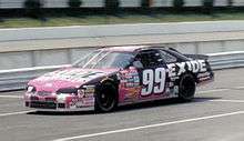 To fill the void left by this departure, Roush elevated Carl Edwards from the Truck series.[61] Edwards showed immediate promise while driving the unsponsored No. 99 car, posting five Top 10 finishes in his shortened season. In 2005—his first full-time season—with sponsorship from Scotts, Office Depot, Stonebridge Life Insurance Company, and World Financial Group, Edwards won 4 races and finished in a tie for 2nd in the points standings. In 2006, Office Depot became the team's exclusive sponsor. Edwards failed to win or make the Chase for the Cup, posting ten Top 5's but finishing 12th in points. Edwards snapped his 52-race winless streak by winning the 2007 Citizens Bank 400 at Michigan International Speedway. In 2008, Edwards posted a series-best 9 wins and also led in Top 5s and Top 10s, but he was still runner-up by 69 points to 3-time consecutive champion Jimmie Johnson.[62] Office Depot did not renew their sponsorship after the 2008 season. In 2009, Aflac became the new sponsor for Carl Edwards and the No. 99 car. Edwards made the chase in 2009 finishing 11th in points despite not winning a race. In 2010, Kellogg's moved from Hendrick Motorsports to join the team as the primary sponsor for 2 races, and associate sponsor for the rest of the season.[63] Scotts also joined Edwards' Cup sponsorship after several years as a Nationwide sponsor. Edwards snapped a 70-race winless skid with his victory in the 2010 Kobalt Tools 500 at Phoenix International Raceway. One week later, he won his 2nd race in a row at Homestead-Miami Speedway in the Ford 400.