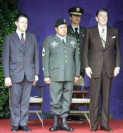 Army Master Sgt. Roy P. Benavidez (center) is flanked by United States Secretary of Defense Caspar Weinberger (left) and President Ronald Reagan at his Medal of Honor presentation ceremony in 1981.