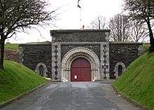The main purpose of the coastal batteries was to provide protected positions for heavy coastal artillery which would be able to engage enemy warships and troopships. In some places, for instance high on a cliff, the guns could be mounted in a barbette or open gun pit. However where the batteries were close to the shoreline and could be engaged directly by enemy gunfire, each heavy gun was mounted in a casemate, a vaulted chamber with embrasure for the gun to fire through which was pierced through an armoured shield. Since being mounted in an enclosed space limited the traverse of the gun, casemates were arranged in a long curved row so that the guns of the battery could follow the progress of a passing enemy ship, each weapon engaging it in turn. The rear of the battery was closed either by a simple wall pierced with loopholes, or by a more elaborate defensible building which doubled as a barracks for the garrison. The intention of these rearward defences was that they would be strong enough to prevent the battery being taken by enemy infantry but weak enough to be demolished should the battery fall into enemy hands.[14] In two forts, Fort Darnet and Fort Hoo, the casemates formed a complete circle; other circular works were built as sea forts with foundations on the sea-bed and entirely surrounded by water.[15] A number of the Royal Commission coastal works were upgrades of existing fortifications, such as the 16th century Pendennis Castle at Falmouth.[13]
