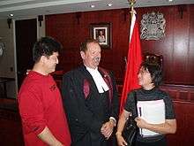 The sovereign is responsible for rendering justice for all her subjects and is thus traditionally deemed the fount of justice,[198] her position in the Canadian courts formally dubbed the Queen on the Bench.[9] Though the monarch does not personally rule in judicial cases, this function of the royal prerogative instead performed in trust and in the Queen's name by officers of Her Majesty's court,[198] common law holds the notion that the sovereign "can do no wrong": the monarch cannot be prosecuted in her own courts—judged by herself—for criminal offences. Civil lawsuits against the Crown in its public capacity (that is, lawsuits against the Queen-in-Council) are permitted, but lawsuits against the monarch personally are not cognizable. In international cases, as a sovereign and under established principles of international law, the Queen of Canada is not subject to suit in foreign courts without her express consent.[172] The monarch, and by extension the governor general, also grants immunity from prosecution,[199] exercises the royal prerogative of mercy and may pardon offences against the Crown,[200][201] either before, during, or after a trial.