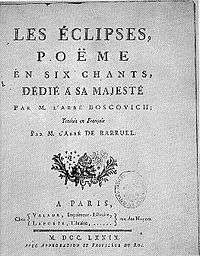 In addition to the works already mentioned Bošković published course material he had prepared for his pupils in mathematics.[13][14] He also published accounts of his travels from Constantinople to Poland[15] which was published in several expanded editions[16] and translated into French.[17]