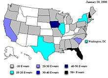 At the onset of the campaign, Giuliani had held a significant lead in the nationwide polls by January 2007.[1] His runner up in the polls, Senator John McCain, had his candidacy falter, and throughout 2007, Giuliani maintained his lead in both national polls and fundraising. Political observers predicted that Giuliani's position would fall, either due to Republican base voters discovering his liberal positions on certain social issues, his personality, management style or the entrance of former Senator Fred Thompson into the race. Giuliani did not campaign actively in the early voting states, hoping to simply survive in these states, and focused instead on the later, larger states. He campaigned in Florida throughout the primary season, hoping a win in the state's primary on January 29, 2008, would give him enough momentum to win the primaries on Super Tuesday (February 5),[2] where he had also campaigned heavily.