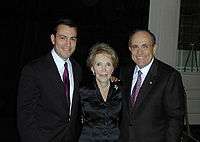 In the general election, Giuliani ran as the fusion candidate of both the Republican and Liberal Parties. The Conservative Party, which had often co-lined the Republican party candidate, withheld support from Giuliani and ran Lauder instead.[46] Conservative Party leaders were unhappy with Giuliani on ideological grounds. They cited the Liberal Party's endorsement statement that Giuliani "agreed with the Liberal Party's views on affirmative action, gay rights, gun control, school prayer and tuition tax credits."[47]