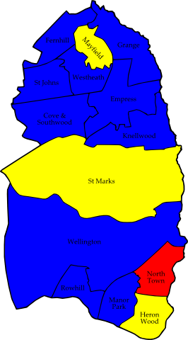 The results saw the Conservatives stay in control of the council with 29 seats compared to 8 for the Liberal Democrats and 5 Labour.[7] The Conservatives gained two seats from the Liberal Democrats in Cove and Southwood and West Heath wards to increase their majority.[8] However the Liberal Democrats did take one seat back in St Marks ward defeating the Conservative councillor for the previous 10 years Nigel Baines.[8] Meanwhile, in Heron Wood ward the Liberal Democrats gained a seat in Aldershot for the first time since 2006 after defeating the sitting Labour councillor.[9] Labour easily held their only other seat in North Town, while narrowly failed to gain Wellington from the Conservatives by 50 votes;[9] however Labour came last in all 9 wards in Farnborough.[8]