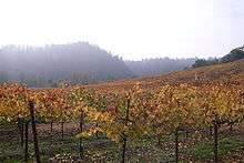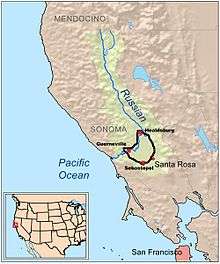 The Russian River Valley AVA is an American Viticultural Area (AVA) in Sonoma County, California. Centered on the Russian River, the Russian River Valley AVA accounts for about one-sixth of the total planted vineyard acreage in Sonoma County. The appellation was granted AVA status in 1983 and enlarged in 2005.[1] The area generally lies between Sebastopol and Santa Rosa in the south, and Forestville and Healdsburg in the north.[1][3] The Russian River Valley has a characteristically cool climate, heavily affected by fog generated by the valley's proximity to the Pacific Ocean. The area is known for its success with cool climate varietals, notably Pinot noir and Chardonnay.[2]