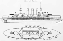 Hizen was assigned to the 1st Fleet on 1 December 1909[28] and was refitted in 1913.[31] She was dispatched to Esquimalt, British Columbia, in October 1914 to reinforce the weak British squadron there, then diverted to Honolulu, Hawaii, before the end of the month to watch the German gunboat SMS Geier after that ship arrived on 15 October. Hizen watched the port in company with the armoured cruiser Asama until Geier was interned on 8 November by the Americans. Afterwards she and Asama headed south in search of the German East Asia Squadron, but never located them;[27] the ship was recalled home in February 1915.[31] On 13 December 1915, Hizen was assigned to the 5th Division of the 3rd Fleet until relieved on 10 May 1917.[28] The ship served in the Indian Ocean at some point during the war where she probably escorted troop convoys.[31]