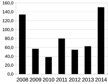 On 16 December 2014, the RTS Index, denominated in U.S. dollars, declined 12%, the most on any given day since the midst of the global financial crisis in November 2008, and the Micex index declined 8.1% at one point before ending the day higher. This increased the decline of RTS Index, up until 16 December, of nearly 30% during the month of December.[55] In response to rising interest rates and bank runs, the interest rate on Russian three-month interbank loans rose to 28.3%, higher than at any point in 2008.[56][57]
