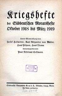 Süddeutsche Monatshefte saluted the July 1914 Crisis and the outbreak of World War I: in the September issue, Karl Mayr wrote that the war signified "internal transformation".[22] The magazine's nationalism became extreme over the following months, with Cossmann arguing in favor of Siegfriede ("victory peace")[23] and Müller celebrating Prussia as a "heroic-aristocratic warrior state";[24] similarly, Hermann Oncken and Friedrich Meinecke wrote praises of militarism and Prussian virtues.[25] Süddeutsche Monatshefte promoted an increasingly radical right-wing platform, supporting militarists Alfred von Tirpitz and Erich Ludendorff while excoriating more moderate military and political elements.[1] In 1916, Cossmann and his magazine defended Tirpitz's submarine war policy, submitting evidence that Tirpitz critic Veit Valentin had falsified military reports.[26] These were times of notoriety for the magazine: prior to the war, Süddeutsche Monatshefte circulation stood at a few hundred copies,[27] rising to 3000-5000 ca. 1914, and increasing sharply after that, reaching 100,000 at times.[1]