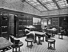 The upper deck housed facilities for officers and first- and second-class passengers. A long forecastle contained the accommodations for the crew and petty officers, as well as a hospital and the third-class lavatories.[13] First-class staterooms for 106 passengers were located close to the middle of the ship. To their rear, between the funnels, was the first-class passenger dining room, spanning the width of the ship. With seating for 208, it featured mahogany furniture and satinwood paneling with inlays, and a glass skylight ceiling that extended up through two decks.[12] Beyond this area were the galleys, sculleries, and pantries that served all passenger classes. Moving further aft, the second-class passenger dining room, which could accommodate 120 diners, was next. It, too, spanned the width of the ship and featured mahogany furniture, but was paneled with tapestry upon a cream-colored ground. Beyond the dining area were cabins for 76 second-class passengers.[13]