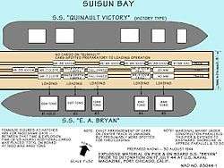 Upon leaving Martinez she sailed up Suisun Bay to Port Chicago Naval Magazine, California arriving approximately 6:00 PM (Pacific War Time) in preparation for her maiden voyage.[3][4] Some difficulty was experienced in mooring because of wind and tide. She was moored on the starboard side headed east at the outboard berth across from the SS E.A. Bryan. Upon arrival at Port Chicago, both the loading officer and his assistants visited the ship, gave copies of pertinent magazine orders to the master, inspected some of the holds and saw the ship being properly rigged for loading. number 5 hold was not being rigged as it was not to be loaded that night This was the first time this vessel had been rigged for loading. Trouble was experienced with shackles and preventer guys as they were non-standard. Whips on some of the winches were on backwards and had to be corrected.