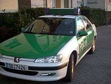 A Peugeot patrol car of the Saarland Police with old green and white livery