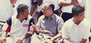 Meanwhile, at school, he developed a reputation as a child prodigy. He had become a common conversation point in local cricketing circles, where there were suggestions already that he would become one of the greats. Sachin consistently featured in his school Shardashram Vidyamandir (English) team in the Matunga Gujarati Seva Mandal (popularly coined MGSM) Shield.[35] Besides school cricket, he also played club cricket, initially representing John Bright Cricket Club in Bombay's premier club cricket tournament, the Kanga League,[32] and later went on to play for the Cricket Club of India.[36][37][38] In 1987, at the age of 14, he attended the MRF Pace Foundation in Madras (now Chennai) to train as a fast bowler, but Australian fast bowler Dennis Lillee, who took a world record 355 Test wickets, was unimpressed, suggesting that Tendulkar focus on his batting instead.[39] On 20 January 1987, he also turned out as substitute for Imran Khan's side in an exhibition game at Brabourne Stadium in Bombay, to mark the golden jubilee of Cricket Club of India.[40] A couple of months later, former Indian batsman Sunil Gavaskar gave him a pair of his own ultra light pads and consoled him to not get disheartened for not getting the Bombay Cricket Association's "Best junior cricket award" (He was 14 years that time). "It was the greatest source of encouragement for me," Tendulkar said nearly 20 years later after surpassing Gavaskar's world record of 34 Test centuries.[41][42] Sachin served as a ball boy in the 1987 Cricket World Cup when India played against England in the semifinal in Bombay.[43][44] In his season in 1988, Tendulkar scored a century in every innings he played. He was involved in an unbroken 664-run partnership in a Lord Harris Shield inter-school game against St. Xavier's High School in 1988 with his friend and team-mate Vinod Kambli, who would also go on to represent India. The destructive pair reduced one bowler to tears and made the rest of the opposition unwilling to continue the game. Tendulkar scored 326 (not out) in this innings and scored over a thousand runs in the tournament.[45] This was a record partnership in any form of cricket until 2006, when it was broken by two under-13 batsmen in a match held at Hyderabad in India.[46]