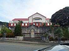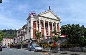 The church was popularly known as "the Basilica", because of its palladian architectural style.[2] It was designated as the Cathedral of Wellington in 1984 after earthquake strengthening and the addition of the Blessed Sacrament chapel, foyer, sacristy, courtyard, hall (called Connolly Hall) and piazza. The parish of Thorndon was administered by the Society of Mary or Marist fathers for eighty-five years until 1935,[3] although secular or diocesan clergy were also stationed there.[4]