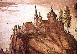 The Sanctuary atop its crag, as depicted in a fresco in Capella XIV. | |