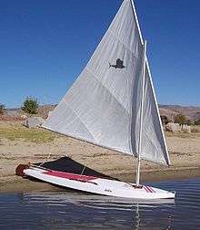 The Sailfish sailboat is a small, hollow body, board-boat style sailing dinghy. The design is a shallow draft, sit-upon hull carrying a lateen sail mounted to an un-stayed mast. This style sailboat is sometimes referred to as a "wet boat" because, with its minimal freeboard, the sailor often gets splashed by spray as the boat moves across the water. This flat top was known in some coves as the "ironing board of the ocean."