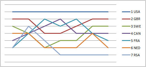 | 6 | Bob Maas | Jan Maas | Holland | 4 | 4 | 6 | 2 | 6 | 2 | DNF | 0 | 5 | 3 | 5 | 3 | DNS | 0 | 14 | |||