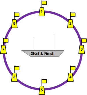 The sailing was done on the triangular type Olympic courses. The start was made in the center of a set of 8 numbered marks that were places in a circle. This made it possible to begin and finish every race sailing against the wind, regardless of the direction of the wind. During the starting procedure the sequence of the marks was communicated to the sailors. Starting upwind ensure a fair start of every race.[2] This mark system is, at least in certain German lakes, still in use in many places.