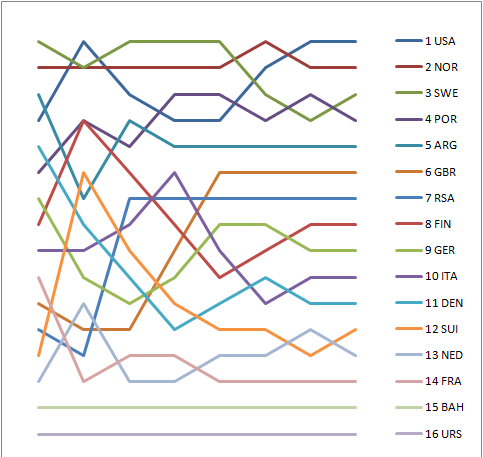 Graph showing the daily standings in the 5.5 Metre during the 1952 Summer Olympics