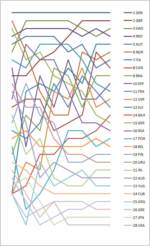 Graph showing the daily standings in the Finn during the 1952 Summer Olympics
