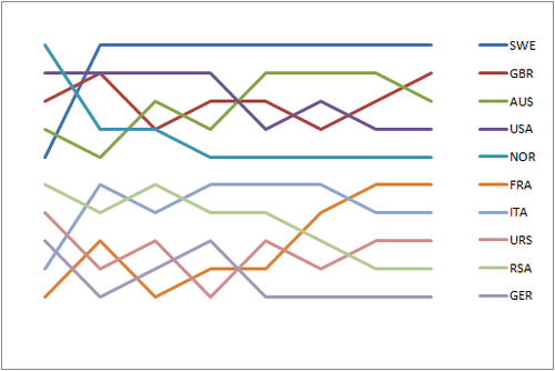 Graph showing the daily standings in the 5.5 Metre during the 1956 Summer Olympics