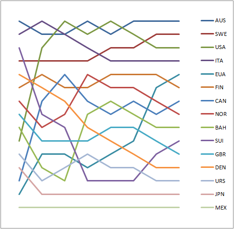 Graph showing the daily standings in the 5.5 Metre during the 1964 Summer Olympics