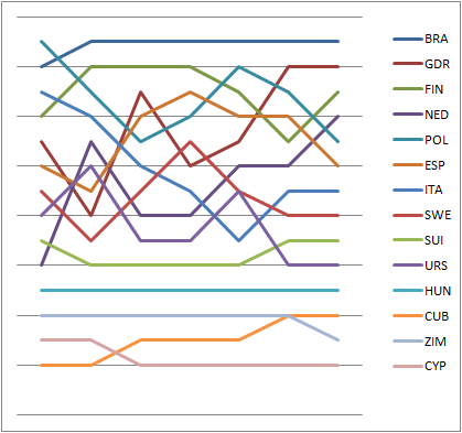 Graph showing the daily standings in the 470 during the 1980 Summer Olympics
