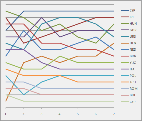 Graph showing the daily standings in the Flying Dutchman during the 1980 Summer Olympics
