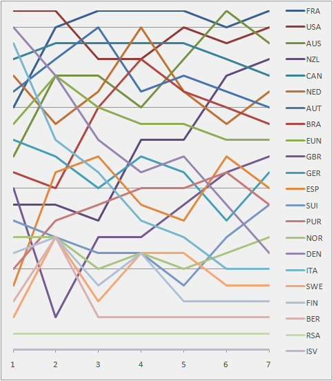Graph showing the daily standings in the Tornado during the 1992 Summer Olympics