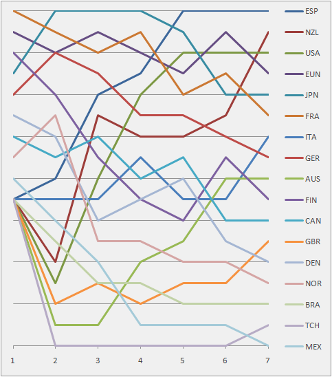 Graph showing the daily standings in the 470 Women's during the 1992 Summer Olympics