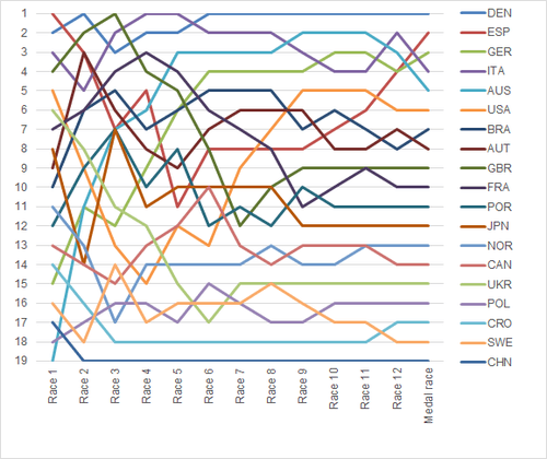 | ● | Practice race | ● | Race on Yellow | ● | Race on Red | ● | Medal race on Yellow |