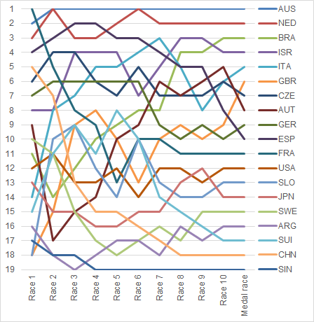 | ● | Practice race | ● | Race on Yellow | ● | Race on Orange | ● | Medal race on Yellow |