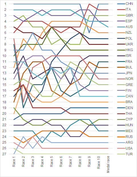 | ● | Practice race | ● | Race on Yellow | ● | Race on Red | ● | Medal race on Yellow |