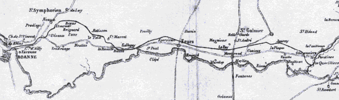 In 1857, the Andrézieux to le Coteau line was restructured to allow operation by heavier and faster trains. The crossing of the threshold of Neulise was abandoned: the first railway to be closed in France. From Balbigny, the track followed the river to le Coteau via six tunnels. The bridge over the Loire between le Coteau and Roanne opened in 1858 .