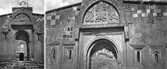 To the west of the main church was the gavit (narthex), which was stylistically similar and, essentially, a continuation of the church. The gavit had a skylight dome in the center. A tower with a small bell stood further to the west of the gavit. The façades of the church and the gavit were decorated with pilasters.[7] The western façade of the gavit had a large portal with the sculpture of, what was believed to be, Bartholomew the Apostle on a horseback, killing a dragon. At the top of the portal there was a semi-circular sculpture of the Holy Trinity. The portal and the sculptures are considered one of the finest in Armenia.[7]