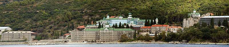 St. Panteleimon Monastery (Greek: Άγιος Παντελεήμων, Aghios Panteleimon; Russian: Пантелеймонов), known as Rossikon (Ρωσσικόν, Русикон), is an Eastern Orthodox monastery built on the southwest side of the peninsula of Mount Athos in Macedonia, Northern Greece. It is often referred to as "Russian" and does have historical and liturgical ties to the Russian Orthodox Church; nevertheless, like all the other monastic settlements on Mount Athos, the monastery is under the direct ecclesiastical jurisdiction of the Ecumenical Patriarchate of Constantinople and all its monks are citizens of Greece, usually naturalized.
