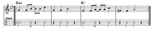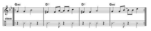 A chord progression can begin on either side of clave. In salsa “one” can be on either side of clave, because the harmonic progression, rather than the rhythmic progression is the primary referent.[75] When a chord progression begins on the two-side of clave, the music is said to be in two-three clave. The following guajeo is based on the clave motif in a two-three sequence. The cinquillo rhythm is now in the second measure.