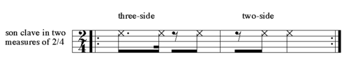 Since a chord progression can begin on either side of clave, percussionists have to be able to initiate their parts in either half (a single measure in 2/2 or 2/4). The following examples show clave with the bongo bell and timbale bell parts in both a 3-2 and a 2-3 sequence. The timbale bell comes from a stick pattern (cáscara) used in the Afro-Cuban folkloric rhythm guaguancó.
