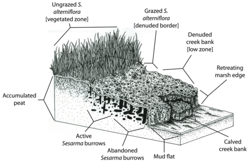 - 1 2 3 4 Bortolus A, Iribarne O. 1999. Effects of the SW Atlantic burrowing crab Chasmagnathus granulata on a Spartina salt marsh. Mar. Ecol. Prog. Ser. 178: 79–88.